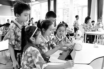 北京市第二十中学附属育鹰小学学生在人工智能教育通识课《从国防到生活—AI人脸识别》了解人脸识别技术。新华社发